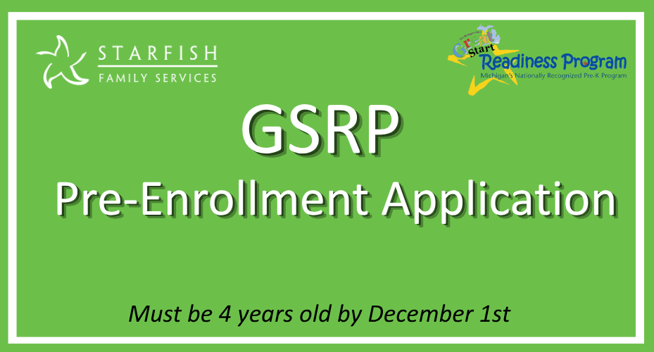 The Great Start Readiness Program (GSRP) is Michigan’s state-funded preschool program for four-year-old children with factors that may place them at risk of educational failure. The program is administered by the Michigan Department of Education, Office of Great Start. Starfish is part of the Great Start Collaborative Wayne County